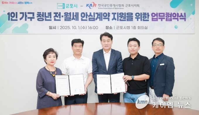 (케이엠뉴스) 군포시는 10월 1일 시청 1층 회의실에서 한국공인중개사협회 군포시지회와 청년 1인 가구 전월세 안심계약 지원을 위한 업무협약을 체결했다.
