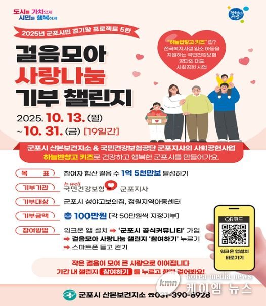 (케이엠뉴스) 군포시 산본보건지소는 오는 10월 13일부터 31일까지(19일간) 국민건강보험공단 군포지사와 함께하는 '걸음모아 사랑나눔' 기부챌린지를 운영한다.