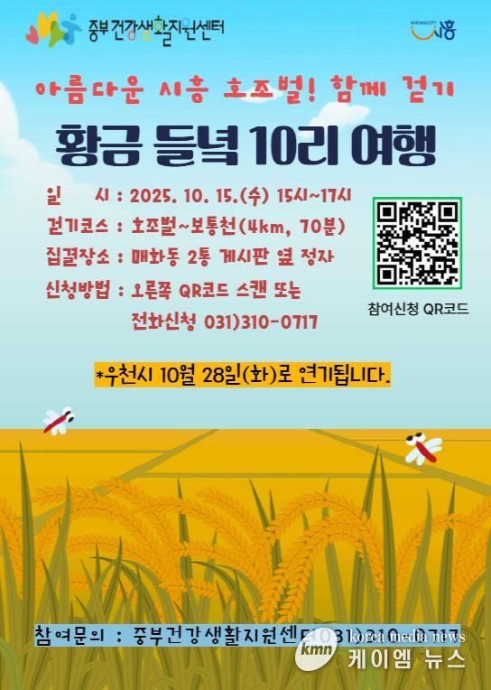 (케이엠뉴스) 시흥시는 오는 10월 15일 오후 3시부터 5시까지 호조벌 일대에서 ‘황금 들녘 10리 여행 걷기 행사’를 연다.