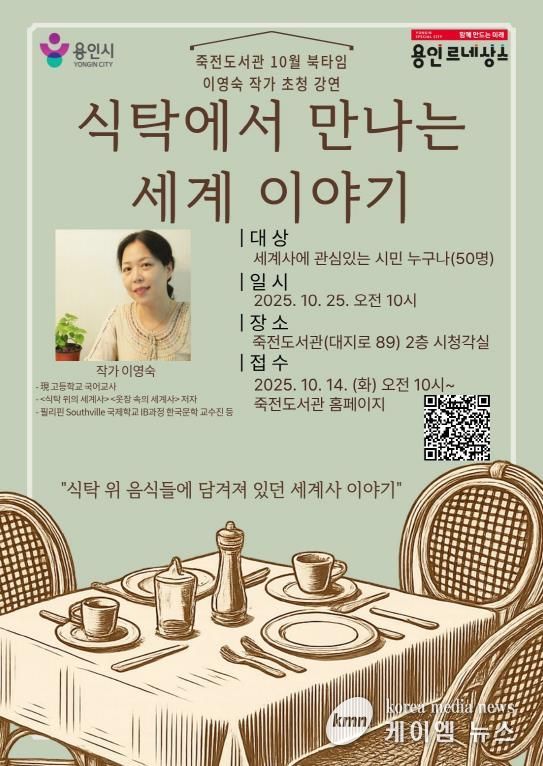 (케이엠뉴스) 용인특례시는 25일 오전 10시 죽전도서관 시청각실에서 죽전도서관 북타임 작가초청강연회 ‘식탁에서 만나는 세계 이야기’를 연다고 13일 밝혔다.