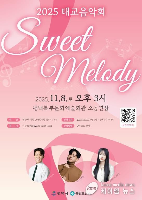 (케이엠뉴스) 평택시 송탄보건소는 임산부 가족의 정서적 안정과 행복한 출산 환경조성을 위해 오는 11월 8일 ‘2025 태교 음악회『Sweet Melody』’를 개최한다.