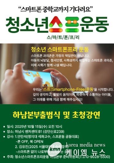 (케이엠뉴스) 15일 오전 10시, 하남시 벤처센터에서 ‘청소년 스마트폰 프리 운동(Smartphone-Free)’ 하남본부 출범식을 갖는다.