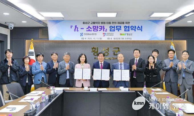(케이엠뉴스) 강원혁신도시발전지원센터(센터)와 건강보험심사평가원(심평원), 횡성군은 10월 13일 횡성군청에서 의료 사각지역 교통 취약계층을 위한 병원이동용 차량 지원 사업 업무협약을 체결했다.