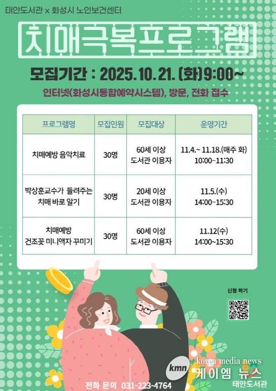 (케이엠뉴스) 화성시문화관광재단 운영 화성시립태안도서관은 10월 14일부터 11월 18일까지 지역 어르신의 건강한 노년을 지원하기 위한 ‘치매극복 프로그램’을 운영한다.