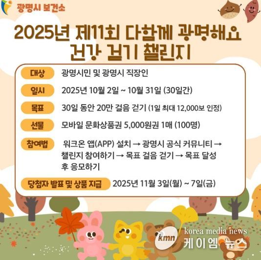 한편 광명시는 오는 31일까지 ‘제11회 다함께 광명해요 건강 걷기 챌린지’를 운영하며, 자세한 사항은 광명시보건소 건강위생과 건강증진팀으로 문의하면 안내받을 수 있다.