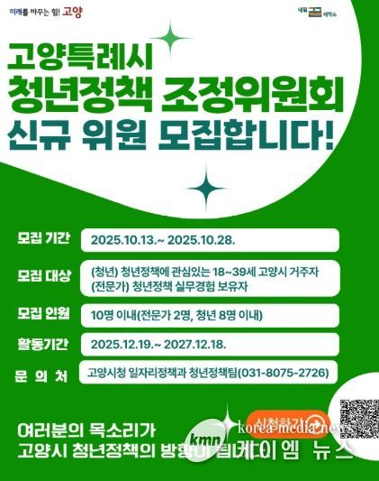 (케이엠뉴스) 고양특례시는 청년이 시정의 주체로 참여해 정책을 함께 만들어갈 수 있도록 고양시 청년정책조정위원회 청년 및 전문가 위원을 공개 모집한다고 밝혔다.