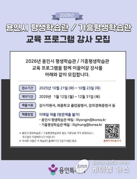 (케이엠뉴스) 용인특례시는 21일부터 23일까지 3일간 ‘2026년 평생학습관 프로그램’을 운영할 강사를 모집한다고 15일 밝혔다.