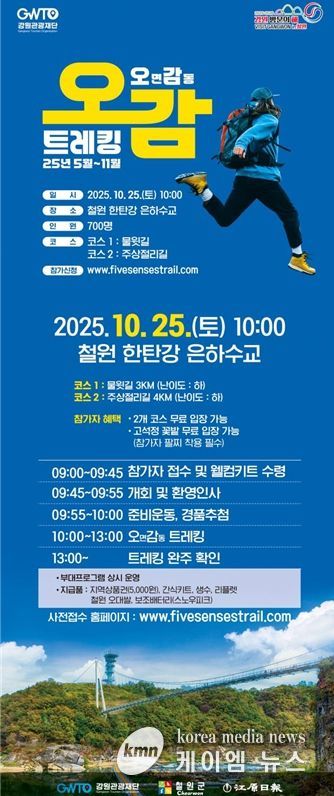 (케이엠뉴스) 강원관광재단은 강원 걷기 여행 활성화를 위해 추진 중인 ‘오감트레킹’행사를 10월 25일, 철원한탄강 은하수교 일원에서 700여 명의 참가자와 함께 개최한다고 밝혔다.