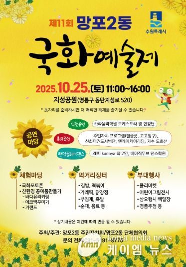 (케이엠뉴스) 수원시 영통구 망포2동 주민자치회는 오는 10월 25일, 영통구 지성공원에서 제11회 국화예술제를 개최한다. 태장동부터 이어져온 이번 축제는 지역주민이 함께 어울리고 즐길 수 있는 참여형 문화행사로 국화포토존, 친환경 공예품만들기 체험부스, 먹거리 장터, 플리마켓 등 다채로운 프로그램이 마련될 예정이다.