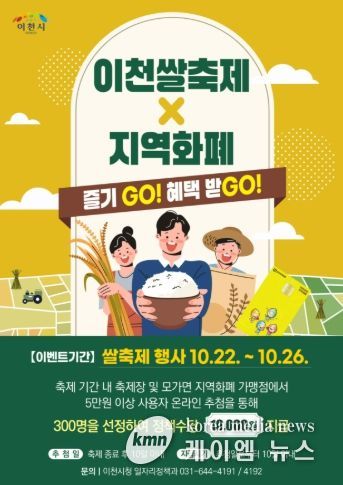 (케이엠뉴스) 이천시는 2025 이천쌀문화축제 기간에 지역화폐 이용을 촉진하고 지역경제를 활성화하기 위해 코나아이(주)의 경기지역화폐 사회공헌 재원을 활용하여 ‘이천쌀축제, 지역화폐로 즐기고(GO), 혜택받고(GO)’ 이벤트를 추진한다고 밝혔다.