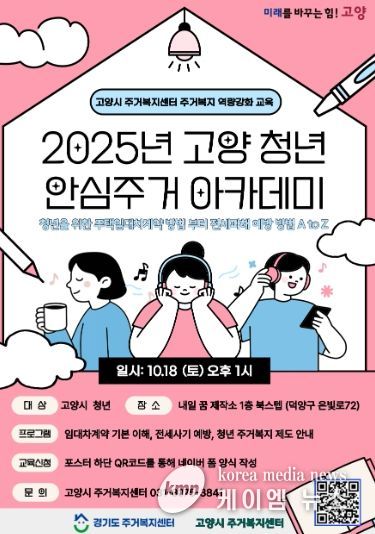(케이엠뉴스) 고양특례시는 청년층의 안정적인 주거생활을 지원하기 위해 오는 10월 18일 13시 내일꿈제작소(덕양구 은빛로 72)에서 ‘2025 고양청년 안심주거 아카데미’를 개최한다고 밝혔다.