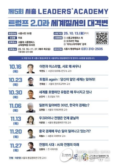 (케이엠뉴스) 시흥시는 서울대학교 본부 직속 연구기관인 통일평화연구원과 함께 '제5회 시흥리더스아카데미'를 10월 16일에 개강한다. 이번 아카데미는 '트럼프 2.0과 세계질서의 대격변'을 주제로 급변하는 국제 정세와 세계 질서의 흐름에 대한 시민들의 폭넓은 이해를 돕고자 마련됐다.