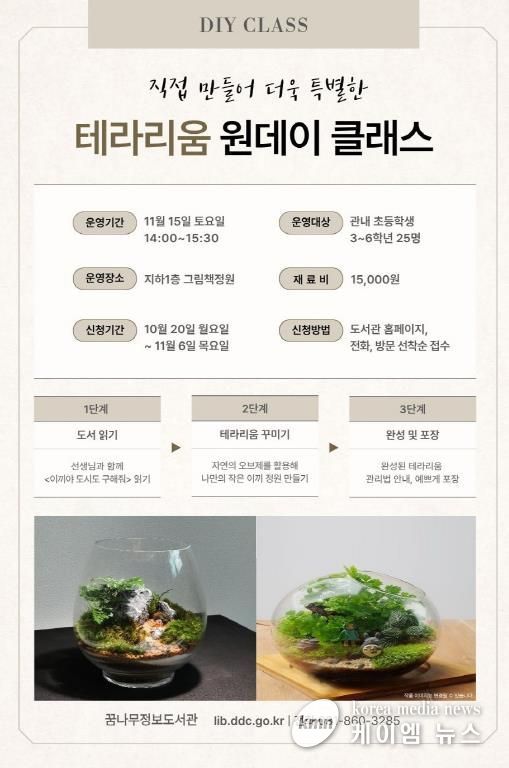 (케이엠뉴스) 동두천시 도서문화사업소 꿈나무정보도서관은 오는 10월 20일부터 초등학교 3~6학년을 대상으로 『테라리움 만들기』 원데이 클래스를 운영한다고 밝혔다.