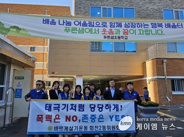(케이엠뉴스) 양주시 바르게살기운동 회천2동위원회(위원장 황영학)가 16일 푸른샘초등학교 앞에서 학생들을 대상으로 학교폭력 예방 캠페인을 실시했다.