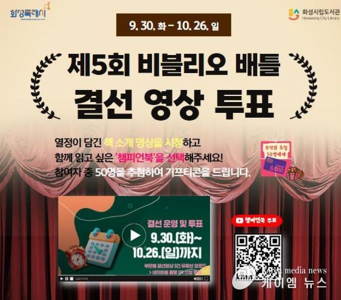 (케이엠뉴스) 화성시문화관광재단은 오는 10월 26일까지 '제5회 비블리오 배틀' 결선 영상투표를 진행한다.