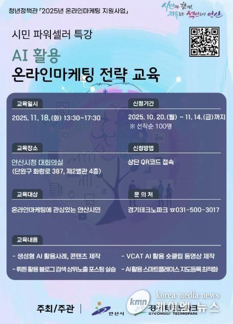 (케이엠뉴스) 안산시는 다음 달 14일까지 생성형 인공지능(AI)을 활용한 온라인 마케팅 역량 강화 ‘시민 파워셀러’ 6회차 교육생을 모집한다고 20일 밝혔다.