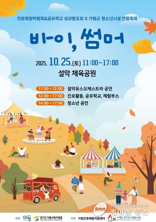 (케이엠뉴스) 가평교육지원청은 10월 25일 11:00시부터 설악청소년 문화의 집 및 설악생활체육공원 일대에서 ‘2025 가평진로체험박람회·공유학교 성과발표회X'바이,썸머'청소년시설 연합축제’를 개최한다.