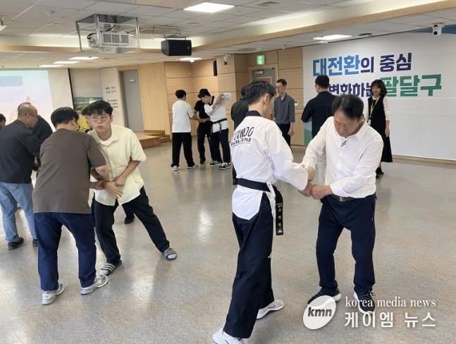 (케이엠뉴스) 수원시 팔달구는 공공청사 내 각종 폭력 및 테러에 대응하기 위해 지난 17일 SOS팔달안전봉사단과 구·동 공직자를 대상으로 구청 대회의실에서 호신술 실습 등 범죄예방 교육을 실시했다.