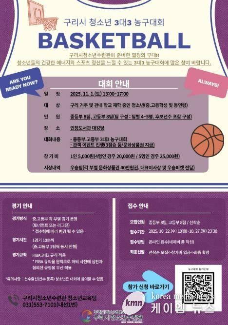 (케이엠뉴스) 구리시청소년재단 청소년수련관은 '2025 구리시 청소년 3대3 농구대회' 참가 신청을 10월 22일부터 10월 27일까지 온라인으로 신청받는다고 밝혔다.