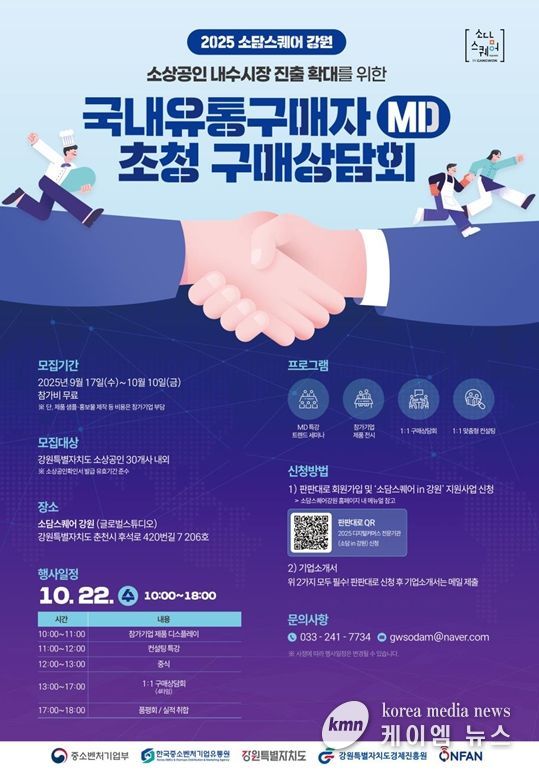 (케이엠뉴스) 강원특별자치도와 강원특별자치도경제진흥원은 10월 22일, '소담스퀘어 인(in) 강원'에서 도내 소상공인을 대상으로 ‘2025 소담스퀘어 강원 엠디(MD)초청 구매상담회’를 개최한다.