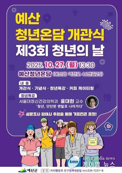 (케이엠뉴스) 예산군은 오는 10월 27일 오후 1시 30분, 예산읍 주교리에 위치한 청년거점공간 ‘예산청년온담’에서 개관식과 제3회 청년의 날 기념행사를 개최한다고 밝혔다.