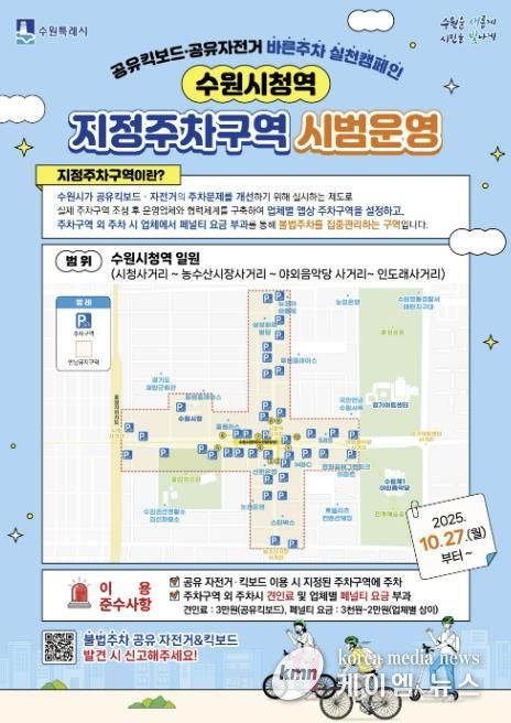 (케이엠뉴스) 수원특례시는 27일부터 수원시청역 일원에서 ‘공유 자전거·킥보드(PM) 지정주차구역’을 시범 운영한다.