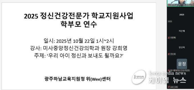 (케이엠뉴스) 광주하남교육지원청 위(Wee)센터는 10월 22일 관내 초·중·고 학부모 130여 명을 대상으로 ‘우리 아이 정신과 가도 될까요? 정신과에 대한 올바른 이해와 편견 해소’를 주제로 비대면 부모 교육을 진행했다.
