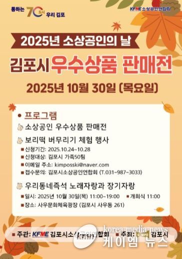 (케이엠뉴스) 김포시소상공인연합회에서 오는 10월 30일 사우문화체육광장에서 지역 소상공인의 우수상품을 소개하는 ‘2025 김포시 소상공인 우수상품 판매전’을 개최한다.