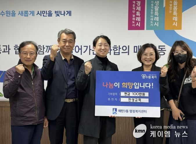 (케이엠뉴스) 지난 23일 수원 천성교회은 매탄3동 저소득가정을 위해 후원금 100만원을 전달했다.