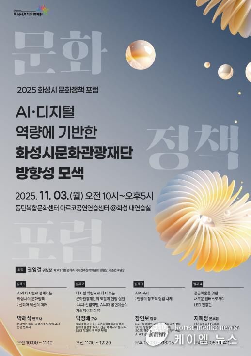(케이엠뉴스) 화성시문화관광재단은 11월 3일(월) 오전 10시부터 오후 5시까지, 동탄복합문화센터 아르코공연연습센터@화성 대연습실에서 ‘2025 화성시 문화정책포럼’을 개최한다고 밝혔다.