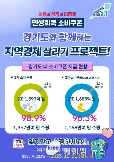 (케이엠뉴스) 경기도가 민생회복 소비쿠폰 2차 지급 신청이 오는 31일 오후 6시 마감된다며 기한 내 신청을 당부했다. 기한이 지난 미신청 금액은 자동 소멸된다.