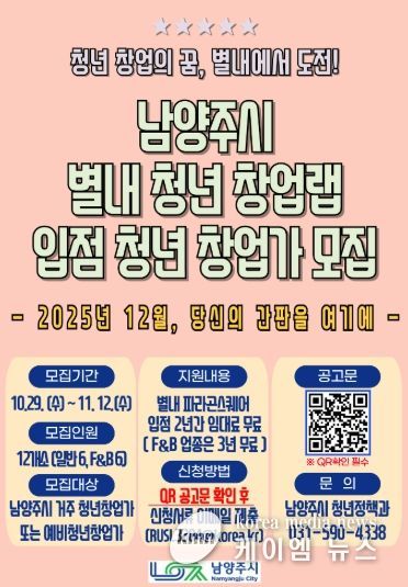 (케이엠뉴스) 남양주시는 29일부터 청년 창업가들을 위한 ‘남양주시 별내 청년 창업랩’ 입점자를 공개 모집한다.