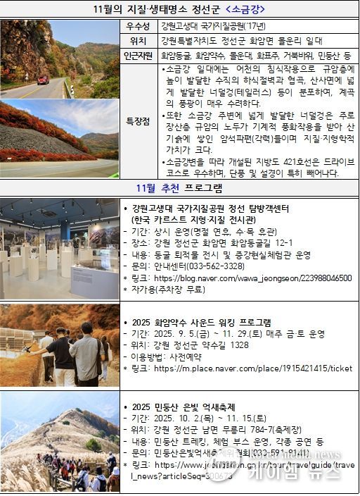 또한 △‘화암약수 사운드 워킹 프로그램’(~11.29.)에서는 맑은 공기 속에서 자연의 소리를 테마로 한 힐링 트레킹을 즐길 수 있어, 지질 탐방과 함께 체험과 휴식을 모두 누릴 수 있다.