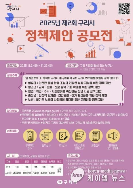 (케이엠뉴스) 구리시는 오는 11월 3일부터 11월 23일까지'2025년 제2회 구리시 정책 제안 공모전'을 개최한다고 밝혔다. 이번 공모전의 주제는 ‘구리 시민(영유아·청소년·청년·중장년·노년) 나이별 맞춤형 정책 아이디어’다.