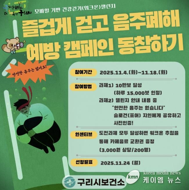 (케이엠뉴스) 구리시는 음주로 인한 신체적·사회적 피해를 예방하고 시민이 스스로 건강한 음주 습관을 실천할 수 있도록 돕기 위해‘즐겁게 걷고, 음주 폐해 예방 캠페인 동참하기’ 참여 잇기(챌린지)를 11월 4일부터 11월 18일까지 15일간 운영한다.
