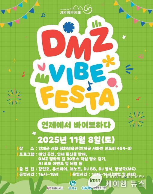 (케이엠뉴스) 강원관광재단이 강원특별자치도, 인제군과 함께 오는 11월 8일 인제군 서화 평화체육관에서‘디엠지 감성 축제(DMZ 바이브 페스타) 인제에서 바이브하다’를 개최한다고 밝혔다.