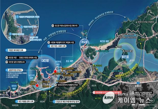 고성 대진항은 “경제도약형(1유형)”으로, 인근 화진포 리조트 개발과 연계해 수산물 가공·유통시설과 관광 인프라를 구축, 민자사업과 어촌이 상생하는 강원 북부권의 해양산업·관광 복합경제 거점으로 육성할 예정이다.