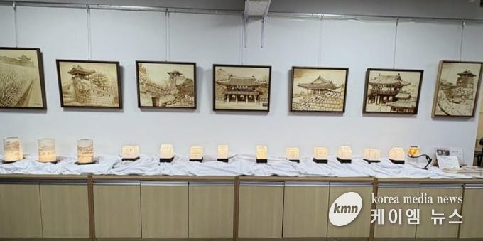 갤러리 벽면에는 수강생들이 직접 완성한 인두화 그림이 전시되어 있으며, 쇼케이스에는 전통 한지를 활용해 만든 미니조명 위에 인두로 그림과 글을 새긴 한지조명 작품이 함께 전시되어 눈길을 끌고 있다.