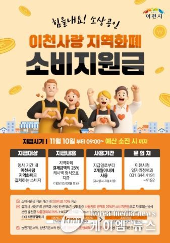 (케이엠뉴스) 이천시는 경기침체로 어려움을 겪는 소상공인을 돕고 지역 내 소비를 촉진하기 위해 11월 10일부터 11월 30일까지 ‘힘을 내요! 소상공인’ 이천사랑 지역화폐 소비지원금 행사를 본격 시행한다고 밝혔다.
