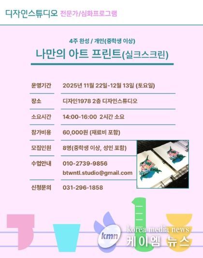 청소년 및 성인 대상의 〈나만의 아트 프린트(실크스크린)〉는 총 4회차로 진행되며, 실크스크린과 모노타입 기법을 활용해 자신만의 아트 프린트를 완성하는 창작 워크숍이다. 참여자는 직접 준비한 도안을 바탕으로 제판, 감광, 잉크, 인쇄 등 판화의 전 과정을 배우고, 이를 통해 자신만의 굿즈와 작품을 제작하게 된다. 상상캠퍼스 관계자는 “실크스크린은 단순한 인쇄를 넘어 개인의 감각을 시각적으로 표현하는 예술”이며 “이번 프로그램을 통해 시민들이 인쇄 예술의 즐거움을 체험하고, 자신만의 디자인 세계를 확장하길 바란다”고 말했다.