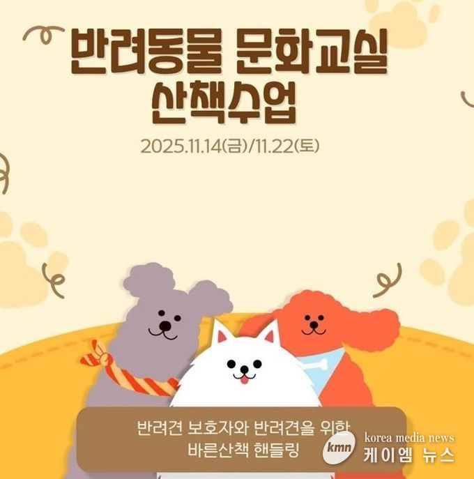 (케이엠뉴스) 시흥시는 오는 11월 14일과 22일 반려동물과 함께하는 문화교실(산책 수업)을 운영한다. 이번 프로그램은 시흥시에 동물 등록이 완료된 반려견을 양육하는 시민을 대상으로 진행되며, 수업별 30마리씩 선착순 모집한다.