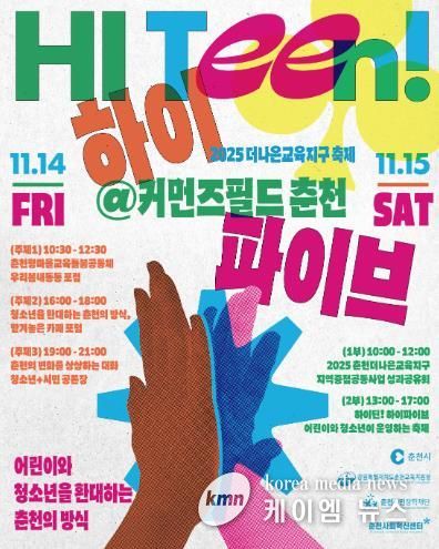 (케이엠뉴스) 춘천교육지원청과 춘천시청은 ‘2025년 춘천더나은교육지구 축제 하이 틴(HI Teen)! 하이 파이브’를 11월 14일부터 15일까지 이틀간 커먼즈필드춘천(공지로255)에서 개최한다.