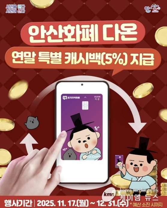 (케이엠뉴스) 안산시는 오는 17일부터 12월 31일까지 ‘지역화폐(다온) 소비 연말 특별 5% 캐시백 이벤트’를 진행한다고 13일 밝혔다.