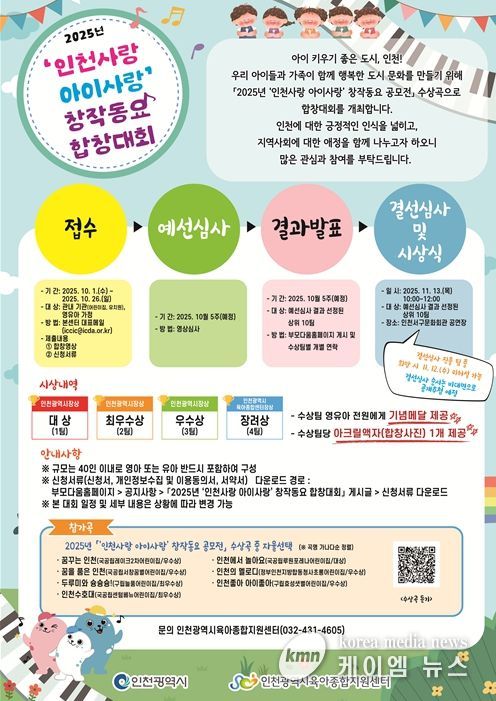 (케이엠뉴스) 인천광역시는 11월 13일 서구문화회관 공연장에서 열린 '2025년 인천사랑 아이사랑 창작동요 합창대회'가 영유아와 가족, 보육교직원 등 500여 명이 함께한 가운데 성황리에 마무리됐다고 밝혔다.