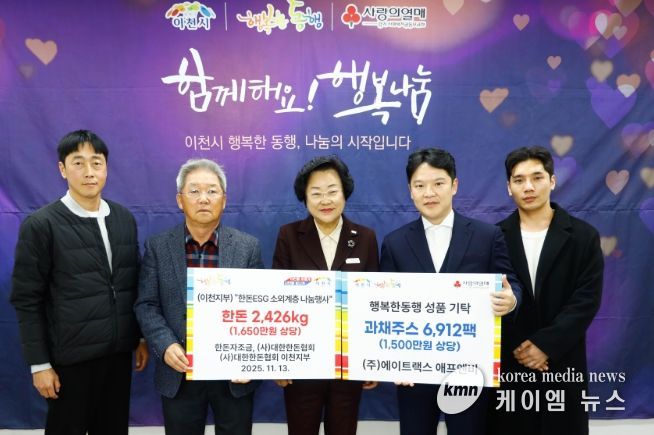 (케이엠뉴스) 이천시는 11월 13일 시청에서 지역 사회를 위한 따뜻한 나눔이 이어졌다고 밝혔다. 이날 기탁식에는 (사)대한한돈협회 이천지부와 ㈜에이트랙스 애프앤비가 참여해 이웃사랑 실천에 동참했다.