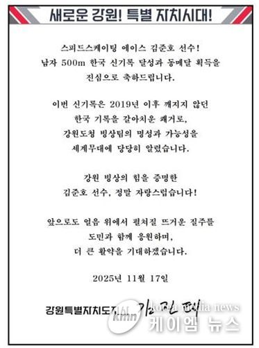 이어, “강원 빙상의 힘을 증명한 김준호 선수가 자랑스럽다”며, “앞으로도 얼음 위에서 펼쳐질 뜨거운 질주를 도민과 함께 응원한다”고 덧붙였다.