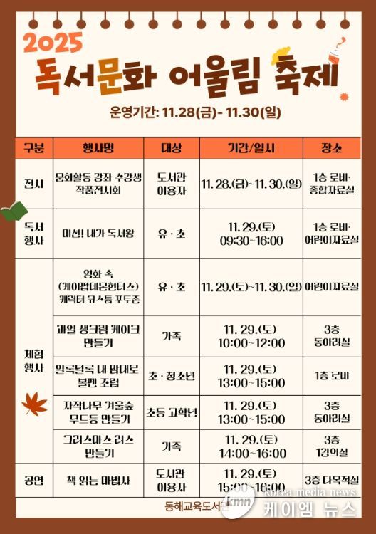 (케이엠뉴스) 동해교육도서관은 11월 28부터 30일까지 3일간 독서·문화 어울림 축제를 운영한다.