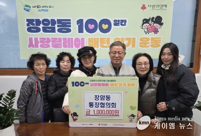 (케이엠뉴스) 의정부시 장암동주민센터는 11월 19일 장암동 통장협의회가 성금 100만 원을 전달하며 ‘100일간 사랑릴레이 배턴 잇기’에 힘을 보탰다고 밝혔다.