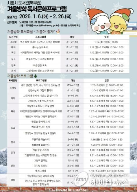 (케이엠뉴스) 시흥시는 겨울방학을 맞아 북부권 8개 공공도서관(소래빛ㆍ대야ㆍ목감ㆍ능곡ㆍ장곡ㆍ은계ㆍ신천ㆍ매화)에서 1월 6일부터 2월 26일까지 겨울독서교실 및 겨울방학 프로그램을 운영한다.