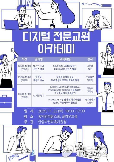 (케이엠뉴스) 경기도안양과천교육지원청은 11월 22일, 디지털 역량을 체계적으로 강화하기 위한 디지털 전문교원 아카데미 연수를 운영했다. 이번 전문과정에는 관내 초등 교원 30명이 참여해 AI 기반 수업 콘텐츠 설계, 챗봇을 활용한 실습, AI기반 평가, 디지털 문해력 기반 수업 혁신 전략 등 심화 전문 영역을 학습했다.